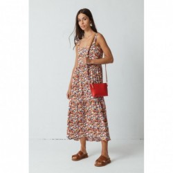 Robe midi évasée. Encolure carrée, fines bretelles et poches latérales. Fermeture éclair sur le côté. Crêpe fluide. Imprimé floral.
