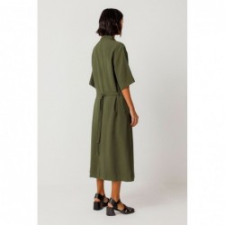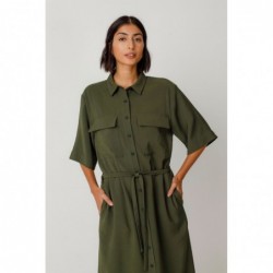 Robe-chemise à manches courtes, coupe décontractée, épaules tombantes et col classique. Elle présente des poches plaquées à rabat sur le devant, des poches latérales et une fermeture boutonnée. Ceinture amovible et empiècements diagonaux inclus.