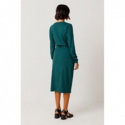 Robe mi-longue cintrée en maille, avec un col en V, des manches longues et un nœud décoratif sur le devant.