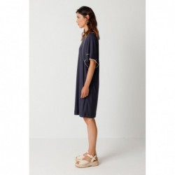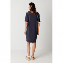 Robe ample à manches chauve-souris 3/4 et finitions contrastantes, confectionnée dans un tissu léger. Encolure bateau féminine et longueur sous le genou.
