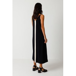 Robe midi sans manches à coupe évasée. Elle présente un décolleté en V et une fente sur le devant, ainsi qu'un empiècement de couleur contrastante à l'avant et un autre au dos.