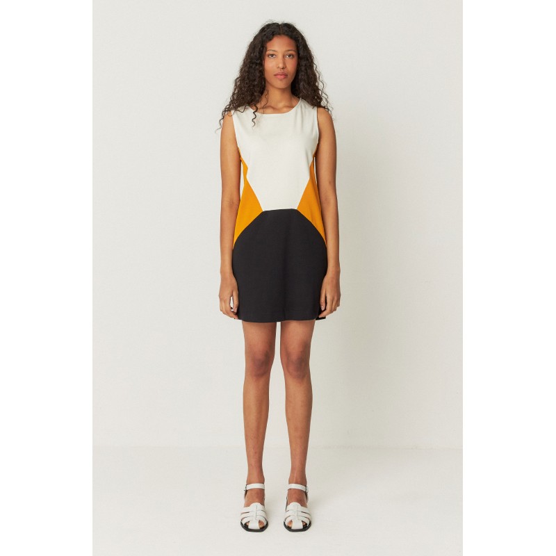 Robe sans manches, au-dessus du genou, aux couleurs contrastées. Modèle facile à porter, confectionné en maille de coton biologique certifié GOTS.