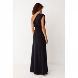 Robe midi asymétrique évasée avec taille côtelée. Tissu plissé à l'épaule. Confectionnée en coton biologique certifié GOTS.
