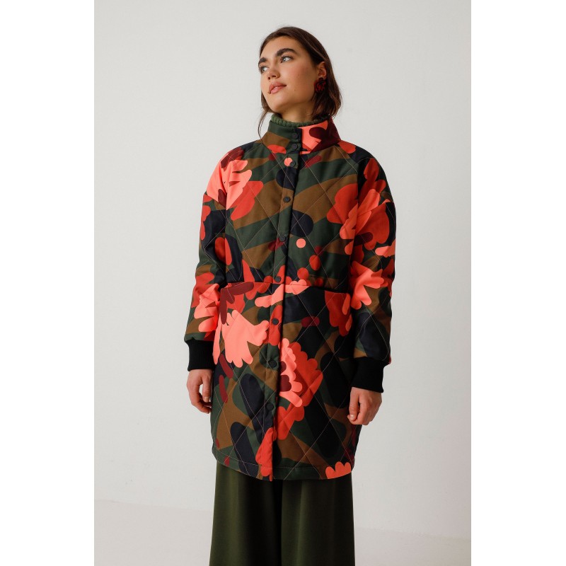 Manteau ample style cocon, à col montant et manches longues avec poignets côtelés. Il est doté de poches avant, d'une fermeture boutonnée, d'une doublure intégrale et d'un matelassage Sorona. Imprimé multicolore.