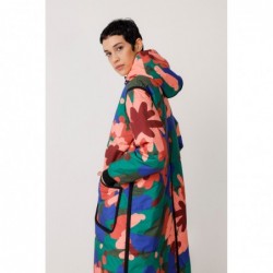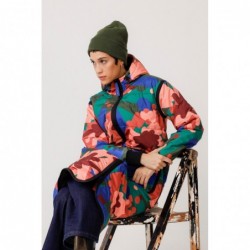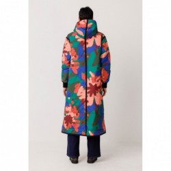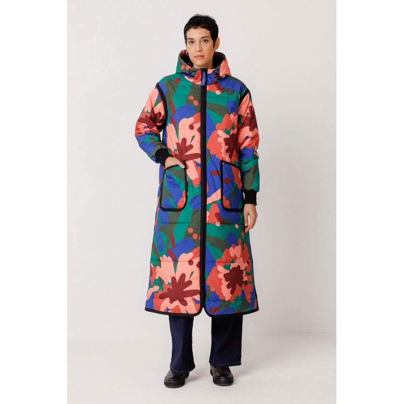 Manteau long matelassé à imprimé multicolore, de coupe trapèze, avec capuche et manches longues. Il possède des poches plaquées sur le devant, une fermeture éclair et une capuche à cordon élastique. Entièrement doublé, ce manteau est confectionné dans un tissu imperméable.