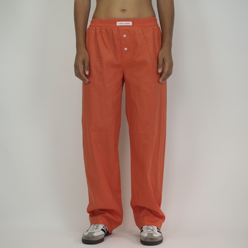 Orlando, avec son sourire éclatant et son esprit libre, m'a conquis instantanément. Nous nous sommes rencontrés à une fête. Sa passion pour la vie était contagieuse. Bien que ses aventures et mon désir de stabilité nous aient éloignés, je me souviendrai toujours de ses gestes romantiques et de la façon dont il m’a appris à vivre l’instant présent. Notre temps ensemble fut bref, mais inoubliable. Pantalon long taille haute unisexe avec taille élastique et fermeture boutonnée sur le devant. Coupe de vêtement oversize. Mesures: Le mannequin mesure 1,70 cm (5'7") et porte la taille S de Hand Over. Tour de poitrine : 86 cm (34 po) Tour de taille : 66 cm (26 po) Hanche : 95 cm (37 po)
