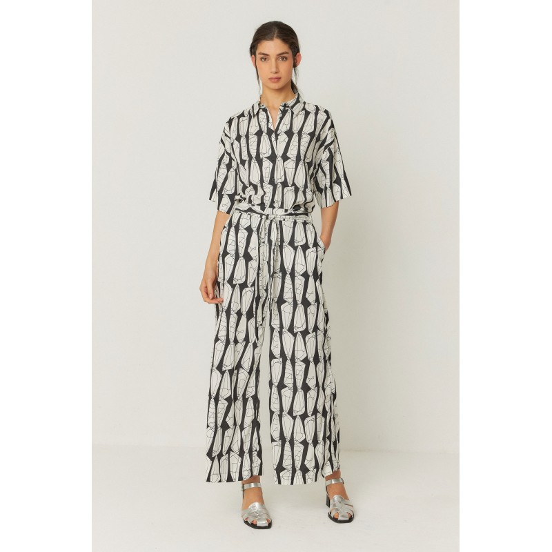 Pantalon palazzo avec taille élastique, ceinture à nouer et poches avant.