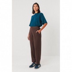 Pantalon coupe carotte longueur cheville avec braguette zippée sur le devant, taille élastique au dos et fausses poches passepoilées à l'arrière.