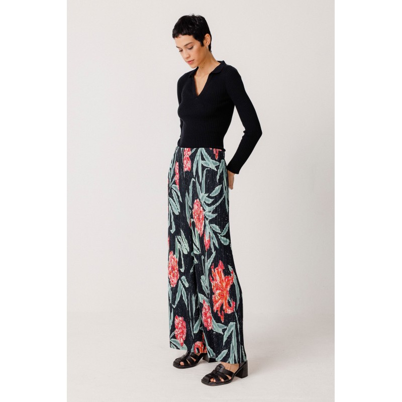 Pantalon culotte à taille élastiquée, confectionné dans un tissu plissé fin, alliant confort et style unique.