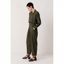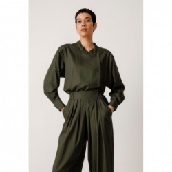 Pantalon long et ample à plis à la taille, poches obliques et ceinture élastique haute, très confortable sans besoin de fermeture.