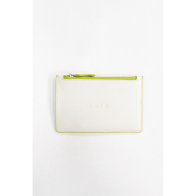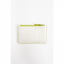 Portefeuille avec porte-cartes pouvant contenir jusqu'à 5 cartes. Fermeture zippée avec tirette en cuir. Dimensions : 10 x 7,5 cm.