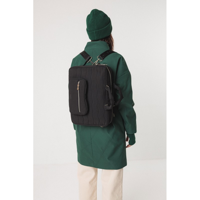 Sac rectangulaire pouvant être porté en bandoulière ou en sac à dos. La sangle au dos permet de l'attacher à une valise. Dimensions : 38 x 28 x 10 cm.