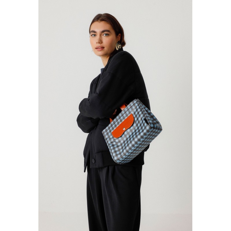 Sac cabas en cuir et coton recyclé, doté de poches avant et arrière, d'une bandoulière ajustable et amovible, d'une fermeture éclair et de boutons-pression pour ajuster sa taille. Il comprend une poche intérieure et une doublure imprimée. Ses dimensions sont de 250 x 200 x 150 mm.