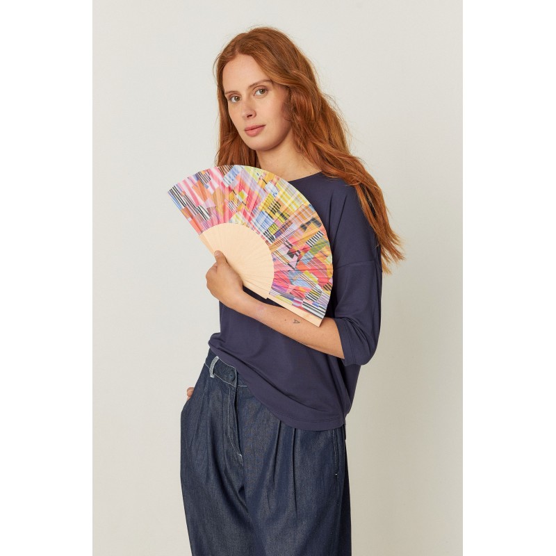 Éventail imprimé fabriqué en Espagne avec du bois naturel et du coton.