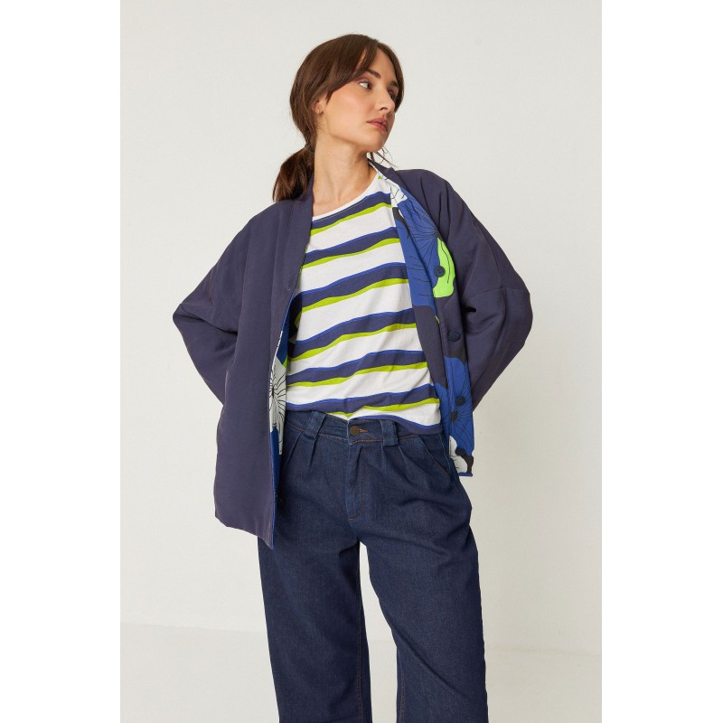Grande veste kimono réversible, matelassée et isolante Sorona. Fermeture boutonnée sur le devant.
