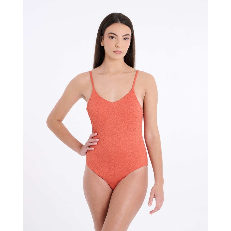 El modelo Symi se presenta en formato bañador de una pieza, confeccionado en tejido texturizado que aporta relieve y un acabado sofisticado. Su diseño de líneas limpias favorece la silueta con un ajuste cómodo y natural. Una propuesta equilibrada, pensada para quienes buscan estilo y sencillez con un punto distintivo.