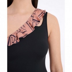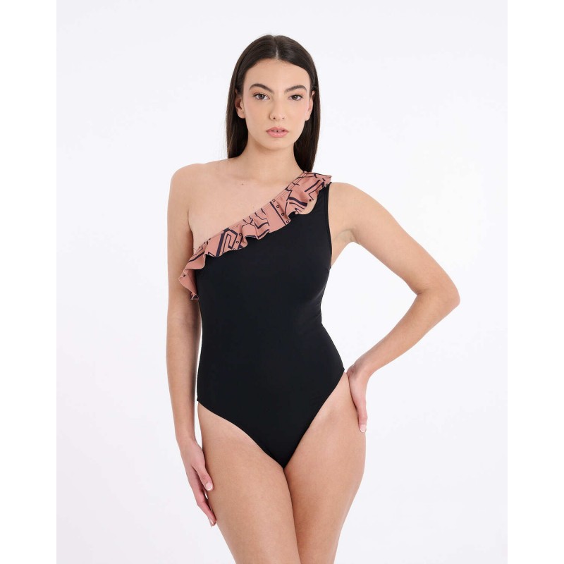 Este bañador de una pieza combina un estampado de inspiración étnica con un diseño asimétrico de un solo tirante y un volante que cruza en diagonal desde el hombro. La silueta aporta movimiento y originalidad, manteniendo un equilibrio entre estructura y fluidez. Una pieza con carácter, pensada para destacar con estilo.