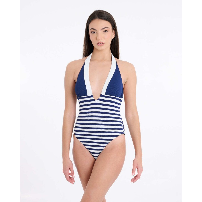El modelo Mikonos se presenta en formato de una pieza con diseño combinado que integra zonas lisas y secciones con estampado de rayas. Su estructura estiliza la silueta y aporta dinamismo visual sin sobrecargar. Una propuesta equilibrada que combina comodidad, sujeción y un acabado gráfico actual.