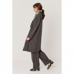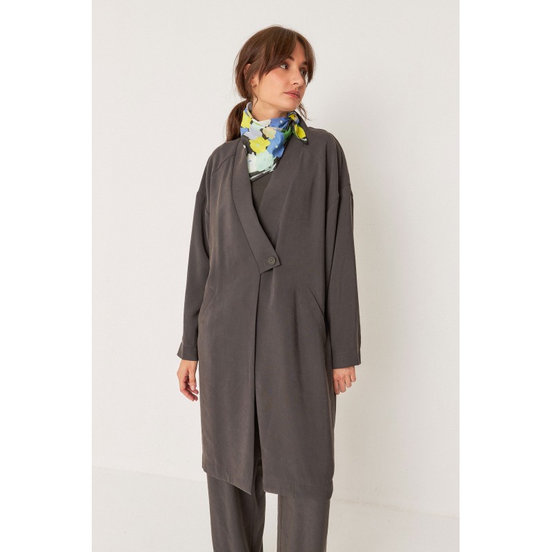 Loose-fitting jacket with a smoking collar, dropped shoulders, and a knee-length cut. It features a front button closure and welt pockets.