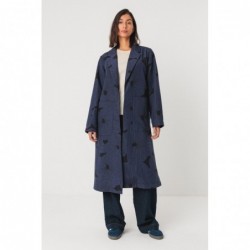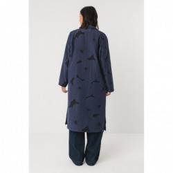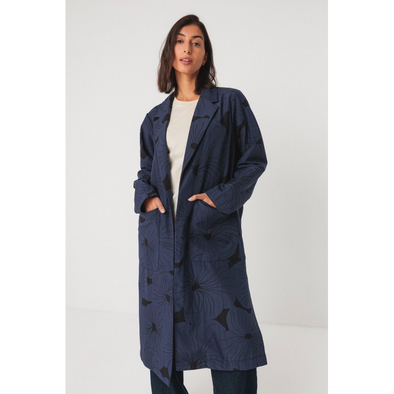 Long, loose-fitting, knee-length open jacket with patch pockets and oriental jacquard print.