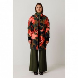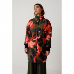 Loose-fitting cocoon-style coat with a stand-up collar and long sleeves with ribbed cuffs. It features front pockets, a button-front closure, is fully lined, and has Sorona quilting. Multicolored print.