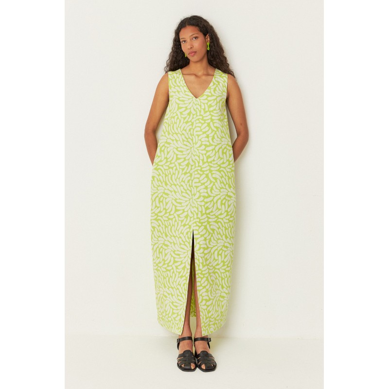 Long, sleeveless, flared dress. Easy to slip on, it features a V-neckline, hand pockets, and a front slit.