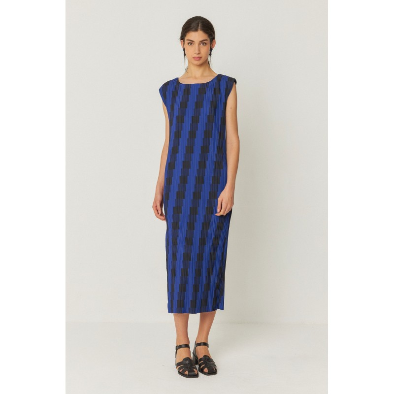 Sleeveless midi dress with a round neckline and reinforced shoulders. Easy-to-wear slip-on style.