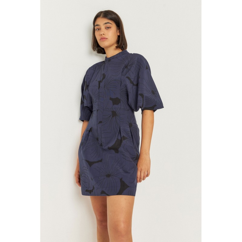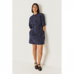 Short jacquard dress with a defined waist, a mandarin collar, and short flared sleeves. It features hand pockets and a front zip closure.