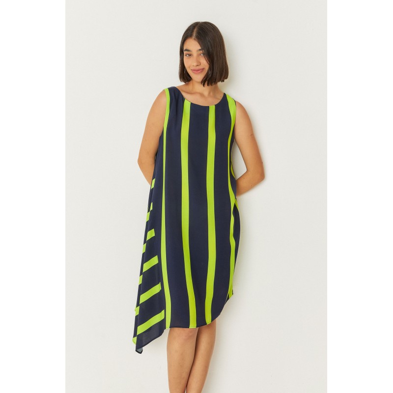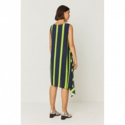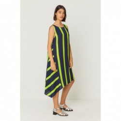Loose-fitting, sleeveless boat-neck dress with an asymmetrical cut and a patch on one side.