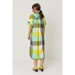 Casual shirt dress with a dropped shoulder. Featuring a classic collar, it features front patch pockets, a button-down closure, and back darts. The short sleeves are lined so the decorative fabric is visible when rolled up.