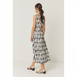 Sleeveless, flared midi dress with a round neckline, a deep back slit, and hand pockets.