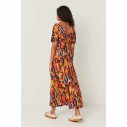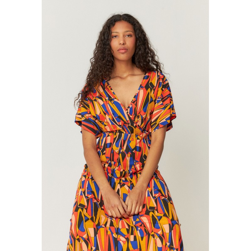 High-waisted, midi-length kimono dress with a flared skirt. It features a V-neck and short sleeves.