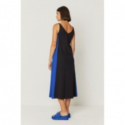 Sleeveless midi dress with a flared silhouette and a V-neck. It features a front slit and contrasting color patches on the sides. Easy-to-wear slip-on style.