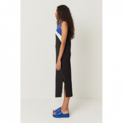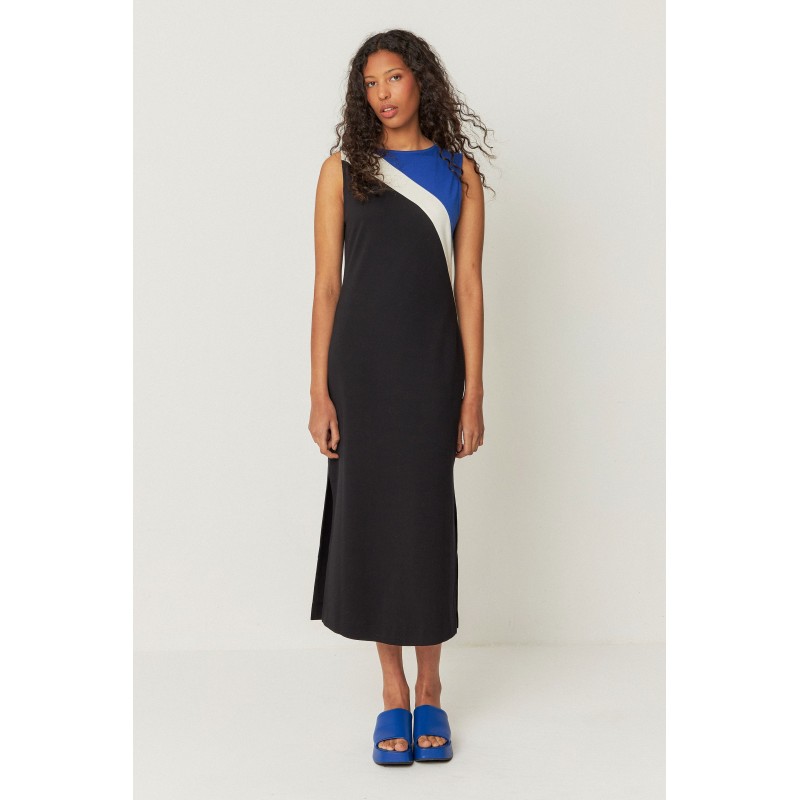 Sleeveless, straight-cut dress with a round neckline, contrasting color patches, and side slits.
