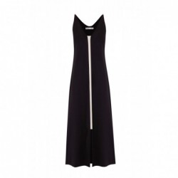 Sleeveless, flared midi dress with a V-neck and front slit. It features a contrasting patch at the front and back.