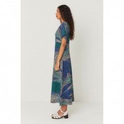 High-waisted, midi-length kimono dress with a flared skirt. It features a V-neck and short sleeves.