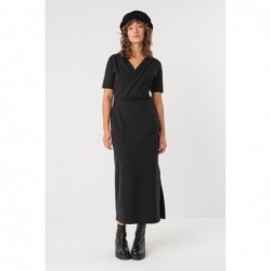 Long dress made of stretch fabric, straight-cut, and featuring a draped V-neck. It has short sleeves and a side zipper closure.
