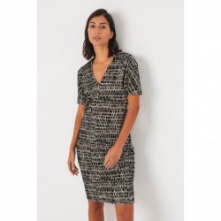 A fitted dress made of stretch organic cotton and cut above the knee. It features a V-neck, a V-shaped back, and short batwing sleeves.