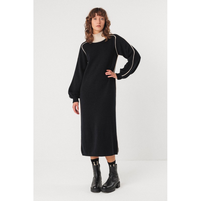 Midi-length dress made from semi-thick organic cotton knit. It's embellished with contrasting stitching, matching the ribbed turtleneck. It has a straight cut and puffed sleeves.