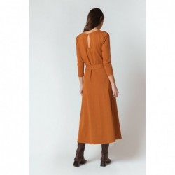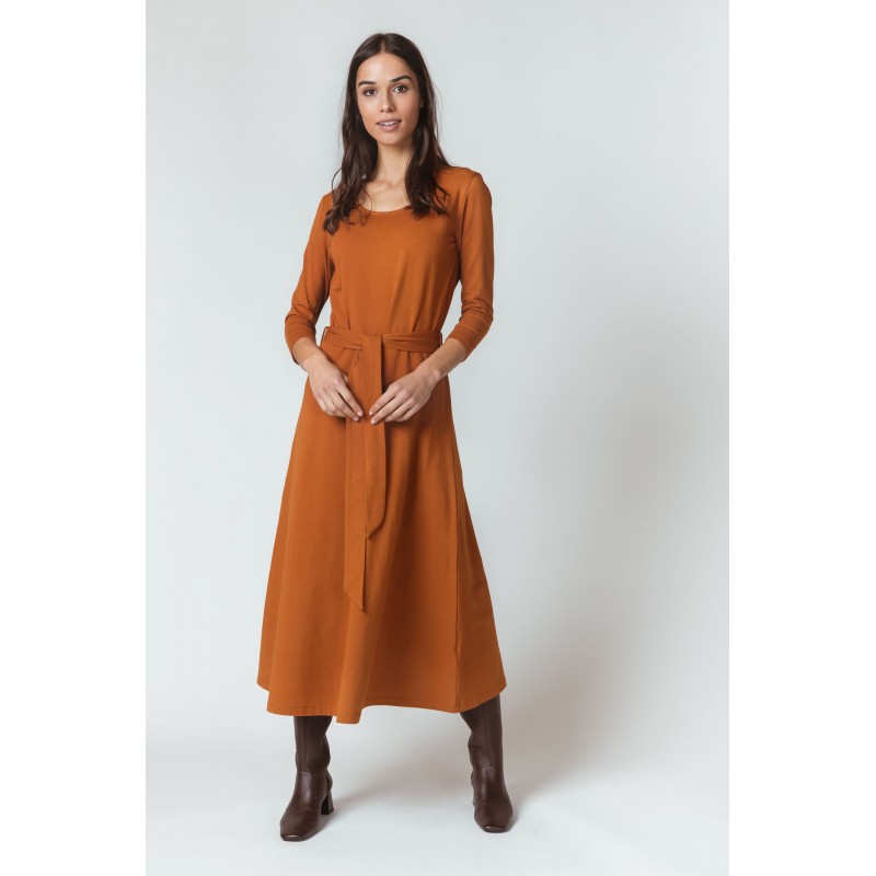Long round neck dress with flared skirt and 3/4 sleeves. Made of stretch cotton, it can be adjusted thanks to a removable belt.