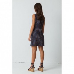 A-line dress above the knee. V-neck, sleeveless, side pockets and button front closure. Plain linen-cotton fabric with a plaid print.