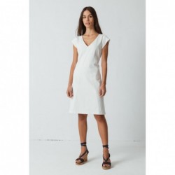 A-line dress, above the knee. V-neck, short sleeves, and side zip fastening. Plain weave linen-cotton check fabric.