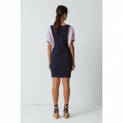 Fitted dress above the knee. Round neck, batwing sleeves. Smocking knit fabric. Color block with multicolored ribbing at the neck.