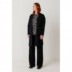 A loose-fitting dress that falls above the knee, featuring a V-neck, long sleeves, front pockets, and a two-way zip closure. It also has rounded side slits at the hem.