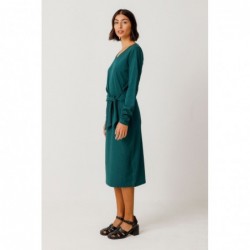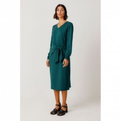 Fitted midi-length knit dress with a V-neck, long sleeves, and a decorative knot at the front.