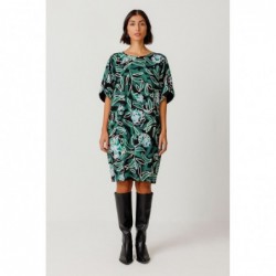 A loose-fitting, knee-length dress with a round neck and batwing sleeves, designed for easy slip-on style. It features a teardrop embellishment on the back and a beautiful floral print.