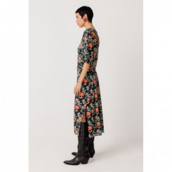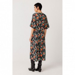 Loose-fitting midi tunic dress with a V-neck, side seam pockets, belt, and short raglan sleeves. Multicolored floral print.