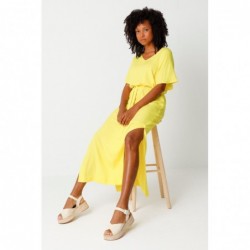 Long, loose-fitting dress in a lightweight fabric. Short-sleeved style with a V-neck and large side slits for added comfort.