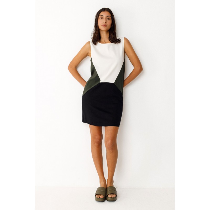 Sleeveless dress, above the knee, with contrasting colors. Easy-to-wear style made from GOTS-certified organic cotton knit.