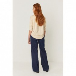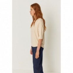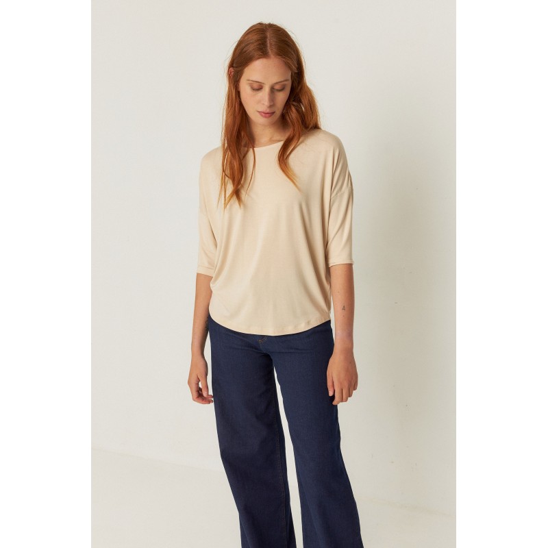 Loose 3/4 sleeve T-shirt with boat neck.